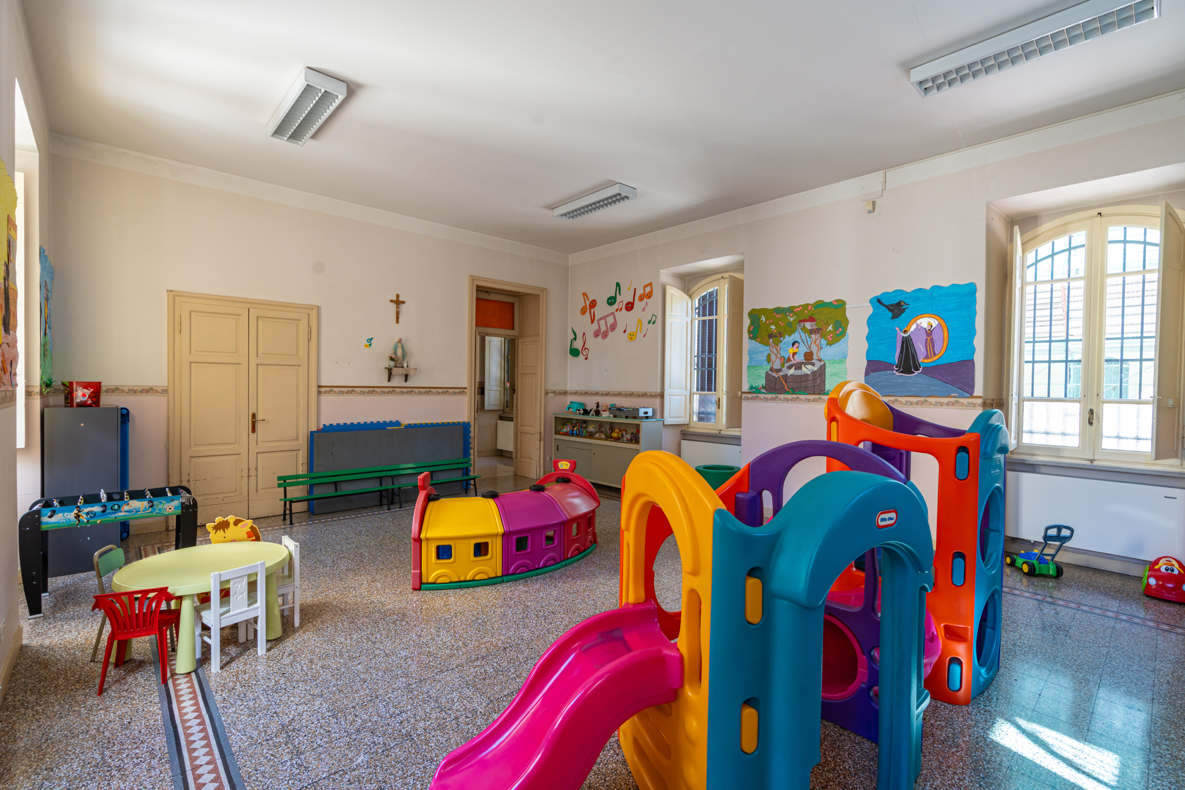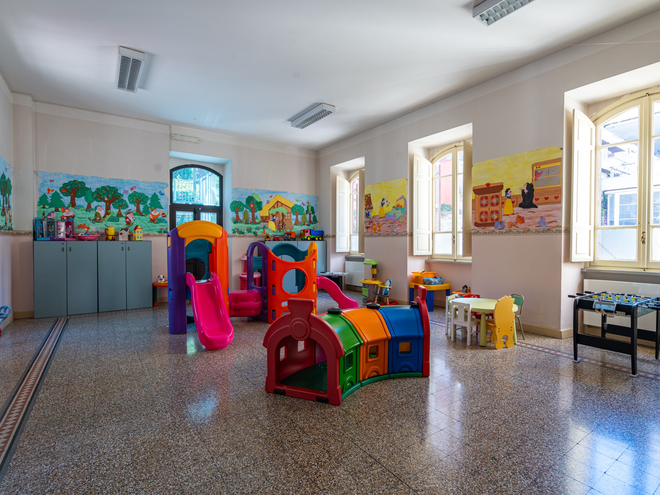 Luminosa e ben organizzata, è progettata per essere versatile in modo da favorire il divertimento e l’interazione dei bambini. Funge da sala di educazione motoria con le relative attrezzature ma, in particolare è dedicata al gioco libero sorvegliato, dove i bambini possono interagire liberamente con i propri compagni. La stanza è spaziosa e riceve molta luce naturale grazie alle grandi finestre che la circondano. All’interno, sono presenti varie strutture colorate per il gioco, tra cui scivoli e tunnel, che stimolano il gioco fisico e la creatività dei bambini. Inoltre, ci sono tavolini e sedie di piccole dimensioni adatte ai bambini, e la stanza è arredata con armadi e scaffali che contengono giocattoli e materiali facilmente accessibili. Le pareti sono decorate con scene di fiabe, che contribuiscono a creare un ambiente piacevole e stimolante.
